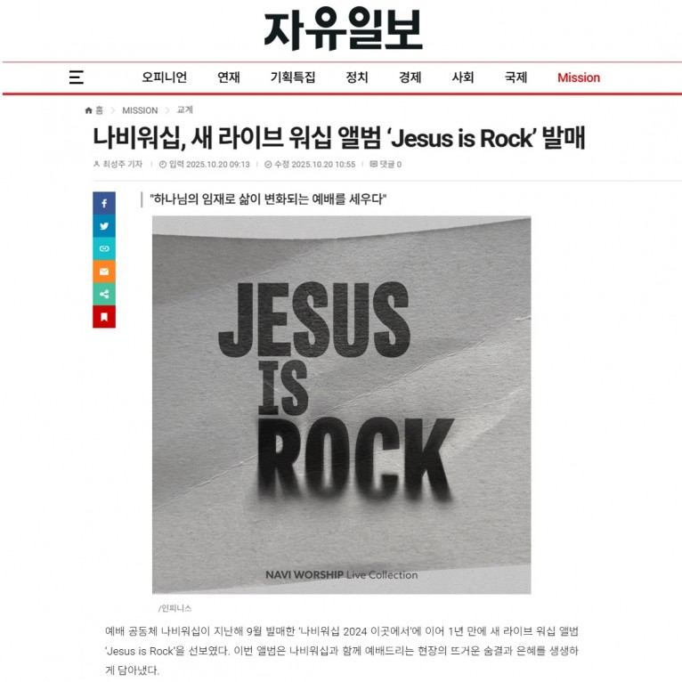 [기사] 나비워십, 새 라이브 워십 앨범 ‘Jesus is Rock’ 발매(자유일보)