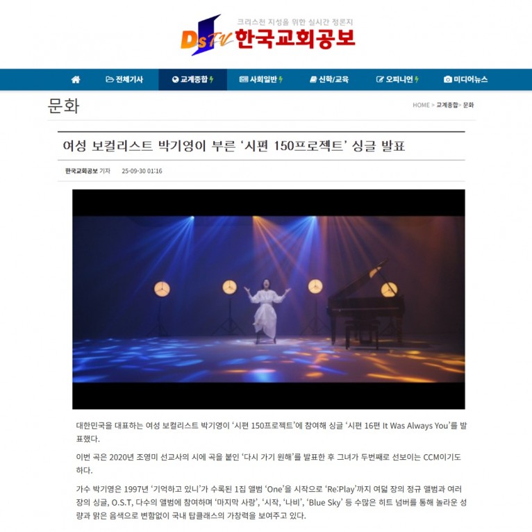뮤직타임 [기사] 여성 보컬리스트 박기영이 부른 ‘시편 150프로젝트’ 싱글 발표(한국교회공보)