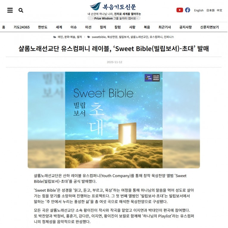 뮤직타임 [기사] 샬롬노래선교단 유스컴퍼니 레이블, ‘Sweet Bible(빌립보서)-초대’ 발매(복음기도신문)